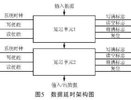 本延時器采用FPGA提供的專用存取模塊FIFO來實現(xiàn)32周期延時,其架構(gòu)體系如圖5所示。在本設(shè)計中,級延遲器的輸出數(shù)據(jù)將作為下一個延遲器的輸入數(shù)據(jù),就相當于級FIFO的數(shù)據(jù)按先進先出的順序依次向第二級FIFO壓入,相鄰兩級的將滿標志與讀使能信號進行握手協(xié)議,從而實現(xiàn)數(shù)據(jù)的延遲輸出。