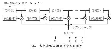 本設(shè)計選用的FPGA芯片是Xilinx公司的Virtex-4SX55,根據(jù)上篇文章中所示的結(jié)構(gòu),得到一種基于DFT多相濾波器組的信道化解決方案,其具體實現(xiàn)結(jié)構(gòu)如圖4所示。