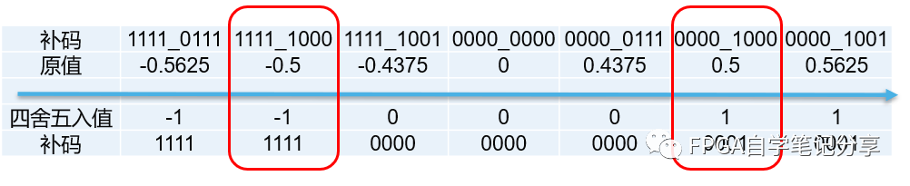 2)四舍五入:如下所示,上一篇文章中說了數(shù)據(jù)的表示(FPGA數(shù)字信號處理之數(shù)據(jù)的表示),看一看到對于補碼,verilog中只針對負數(shù)的0.5進行特殊處理即可。