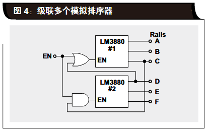 在圖 4 中,兩個(gè)排序器級(jí)聯(lián)在一起以實(shí)現(xiàn) 6 個(gè)有序的電源軌。 上電時(shí),AND 門確保第二個(gè)排序器在其接收到一個(gè) EN 信號(hào)且 C 電源軌被觸發(fā)之前不被觸發(fā)。