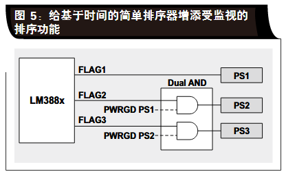 如圖 5 所示,通過(guò)簡(jiǎn)單地在 FlagX 輸出和 PG 引腳之間增設(shè)幾個(gè) AND 門,就能給圖 4 中的電路添加受監(jiān)視的排序功能。