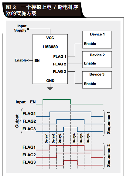 實(shí)施上電排序會(huì)比實(shí)施斷電排序更加容易。 為了實(shí)現(xiàn)上電和斷電排序,人們推出了能夠相對(duì)于上電序列進(jìn)行斷電序列的逆轉(zhuǎn)(序列 1)乃至混合(序列 2)的簡(jiǎn)單模擬排序器。