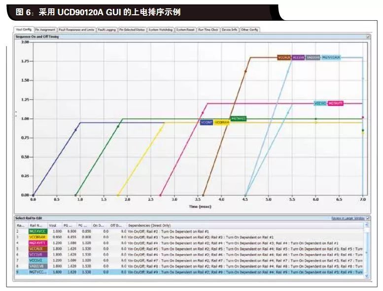 數(shù)字系統(tǒng)健康狀況監(jiān)視器配有一個(gè)圖形用戶界面 (GUI),其可用于設(shè)置上電和斷電排序以及其他的系統(tǒng)參數(shù)(圖6)。另外,有些數(shù)字系統(tǒng)健康狀況監(jiān)視器還具有非易失性誤差和峰值記錄功能,可在發(fā)生欠壓事件的場(chǎng)合中幫助完成系統(tǒng)故障分析。