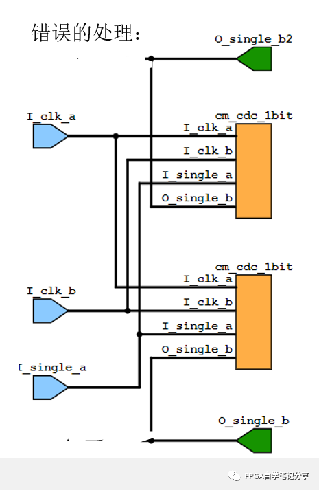錯(cuò)誤的處理方式如下,這種處理方式下,由于b和b2分別做的跨時(shí)鐘域,由于時(shí)鐘抖動(dòng)、走線路徑的原因,會(huì)導(dǎo)致b和b2不同步,如果該信號(hào)是一個(gè)關(guān)鍵的控制信號(hào),會(huì)導(dǎo)致系統(tǒng)異常,要注意避免這種情況的發(fā)生。