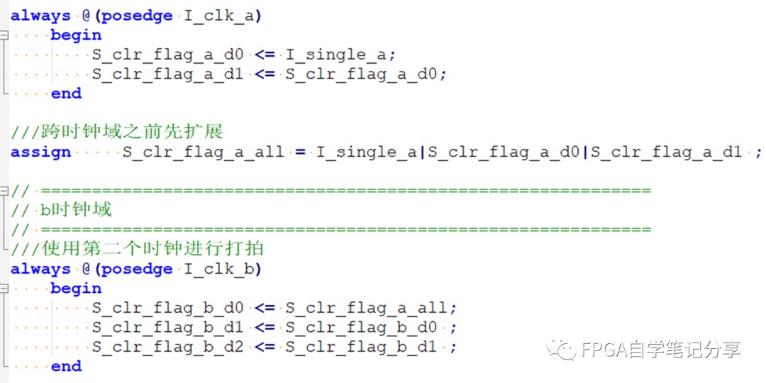 1、跨時(shí)鐘域之間不能存在組合邏輯。 跨時(shí)鐘域本身就容易產(chǎn)生亞穩(wěn)態(tài),如果在跨時(shí)鐘域之間存在組合邏輯會(huì)大大增加競(jìng)爭(zhēng)冒險(xiǎn)出現(xiàn)的概率。 這一點(diǎn)在實(shí)際設(shè)計(jì)中通常會(huì)因?yàn)榇中亩鴮?dǎo)致設(shè)計(jì)異常,如下邊代碼中的S_clr_flag_a_all信號(hào),就是在擴(kuò)展時(shí)不小心使用了組合邏輯,這種情況下由于競(jìng)爭(zhēng)冒險(xiǎn),會(huì)導(dǎo)致跨時(shí)鐘域后的b信號(hào)出現(xiàn)一個(gè)clk的異常電平。
