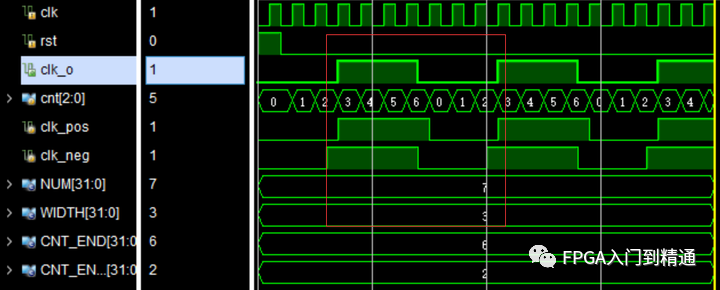 從圖中看出,輸出了7分頻時鐘信號,與預(yù)期一致。