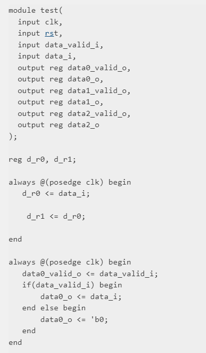 FPGA復(fù)位需要消耗FPGA內(nèi)部資源,也會(huì)影響FPGA布線和時(shí)序收斂,所以對(duì)于每個(gè)寄存器都進(jìn)行復(fù)位并不是最優(yōu)方案,比如寄存器變量延遲幾拍、有使能信號(hào)或有效信號(hào)控制的信號(hào)變量等情況都可以不做復(fù)位處理,如下所示:
