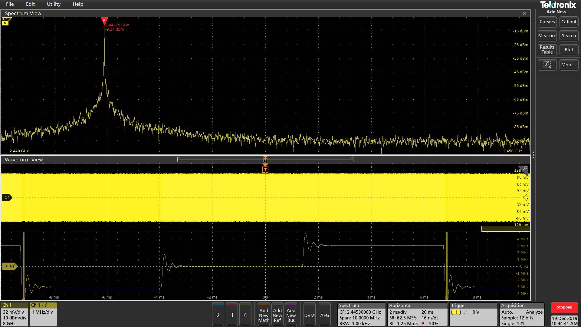 泰克4/5/6系MSO混合信號(hào)示波器具有的RFVT(射頻與時(shí)間相關(guān))硬件觸發(fā)選項(xiàng)。如圖所示為開(kāi)啟RF幅度與時(shí)間波形視圖后觀察到的跳頻信號(hào),可以直觀地看到該信號(hào)每隔約5毫秒跳頻一次,跳過(guò)三個(gè)頻率。RFVT選件支持在該波形的邊沿、脈寬和超時(shí)事件的上進(jìn)行硬件觸發(fā),更快地捕獲異常。除此以外另還有RF頻率、RF相位與時(shí)間相關(guān)觸發(fā)功能。