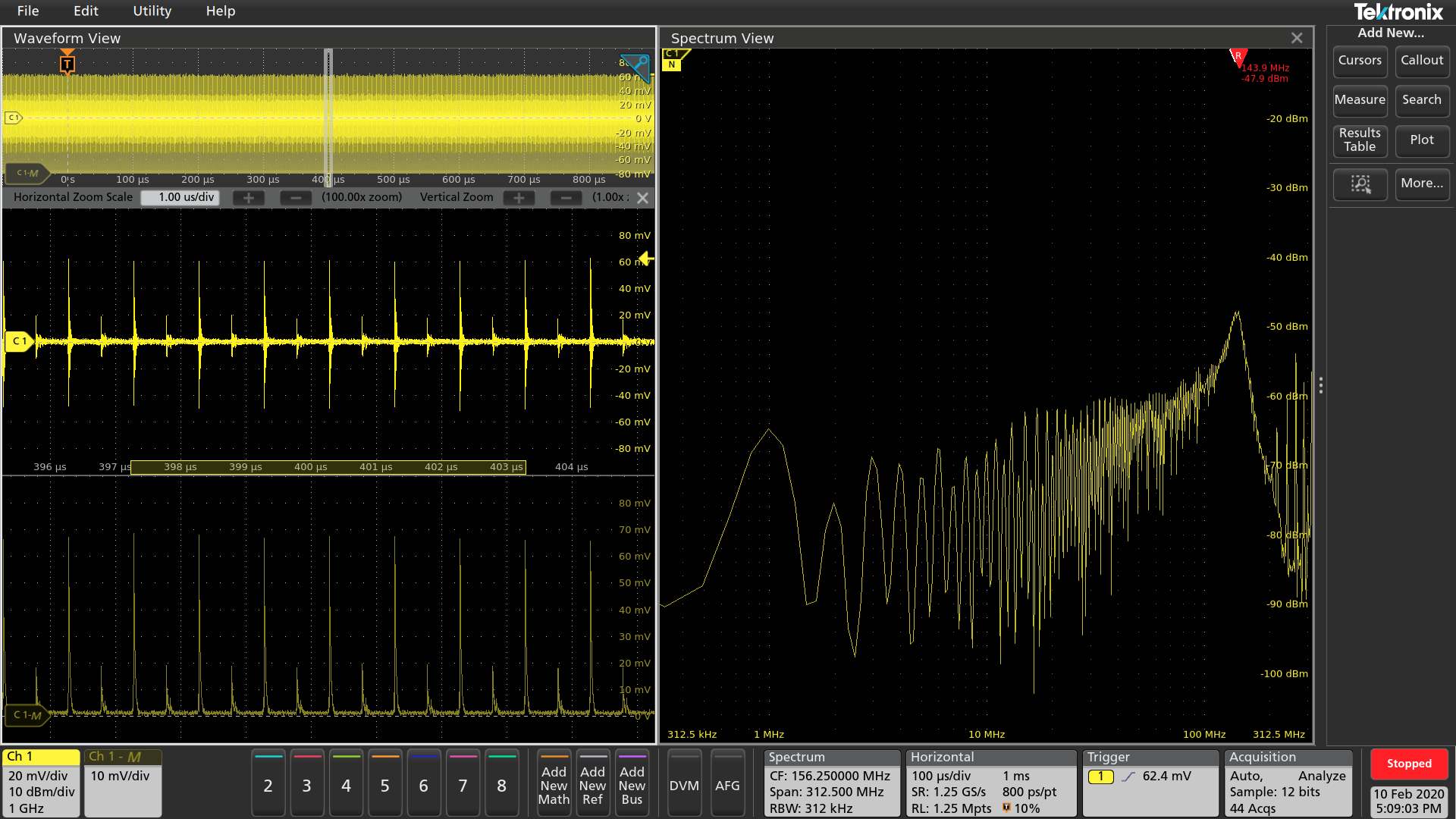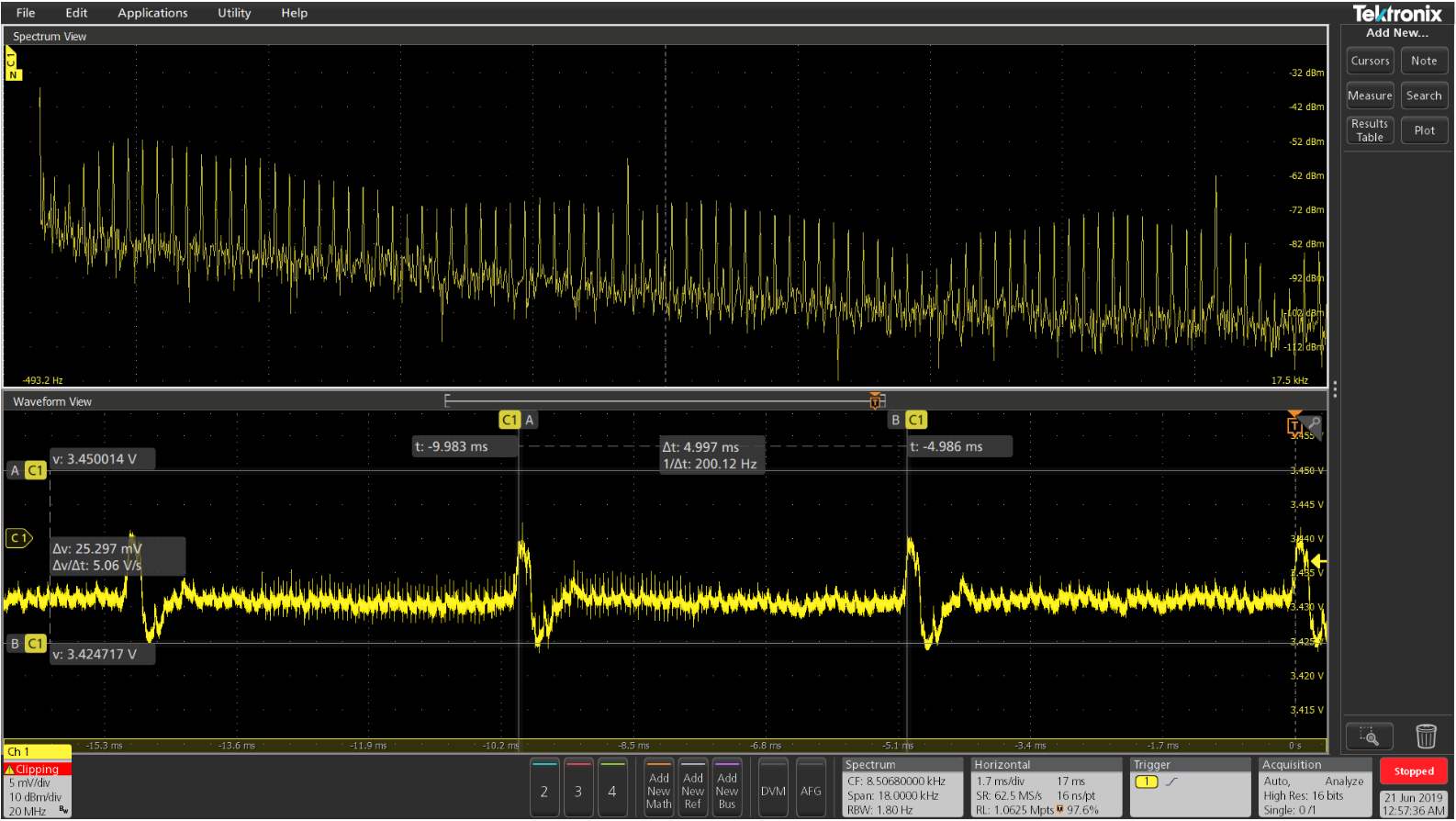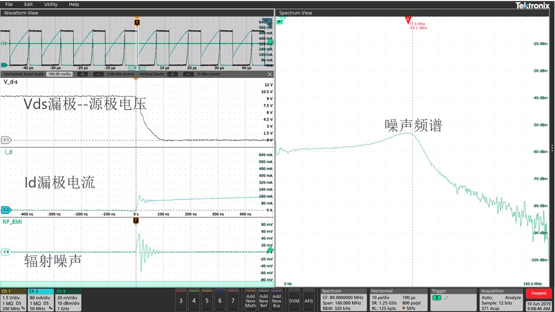 下圖為使用高壓差分探頭、電流探頭和近場(chǎng)探頭測(cè)量MOSFET的導(dǎo)通瞬間。在頻譜視圖下可同步觀察導(dǎo)通瞬間的頻譜變化情況。