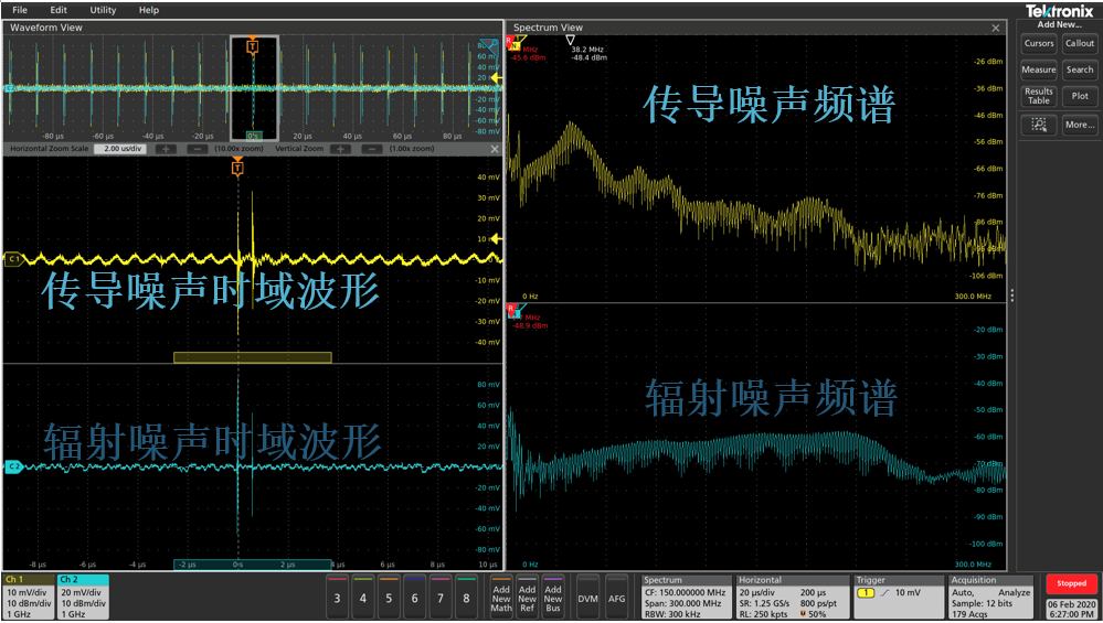 不同于頻譜分析儀,4/5/6系MSO示波器頻譜視圖可以使用任何類(lèi)型的探頭,測(cè)量極低頻率的信號(hào),并且支持多通道測(cè)量。上圖所示為噪聲頻譜,支持將橫軸設(shè)置為對(duì)數(shù)坐標(biāo)。下圖為同時(shí)觀察傳導(dǎo)和輻射噪聲的時(shí)域和頻域。
