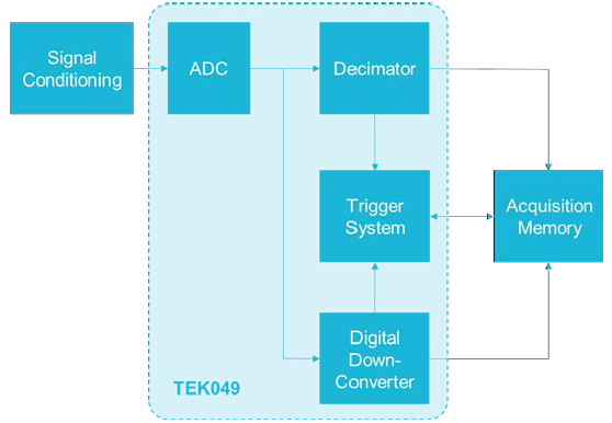 泰克4/5/6系MSO示波器標(biāo)配的SpectrumView既為時(shí)域提供了一個(gè)抽取濾波器,又在每個(gè)FlexChannel后面為頻域提供了一個(gè)數(shù)字下變頻器。如圖所示的信號(hào)采集和處理架構(gòu),模擬信號(hào)經(jīng)過(guò)ADC轉(zhuǎn)換為數(shù)字信號(hào)后,時(shí)域和頻域是并行處理的,使得時(shí)域和頻域捕獲時(shí)間可以獨(dú)立設(shè)置。因此兩條不同的采集路徑可以同時(shí)觀察輸入信號(hào)的時(shí)域視圖和頻域視圖,并為每個(gè)域提供獨(dú)立的采集設(shè)置,就像頻譜分析儀一樣發(fā)現(xiàn)穩(wěn)態(tài)及瞬態(tài)的射頻活動(dòng)。