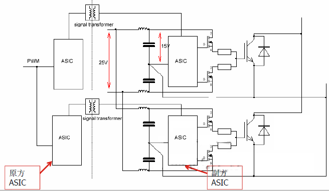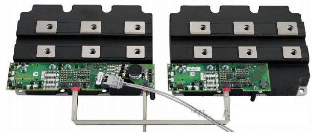 1. SCALE-2芯片組使用磁隔離時,PWM信號傳輸延時為80ns±4ns,這樣的精確延遲可以確保驅動器直接并聯(lián)技術得以實現(xiàn); 2. 副方芯片自身的穩(wěn)壓功能使驅動電壓一致性得到保證; 使用了直接并聯(lián)技術的1SP0635,及1SP0335如下圖: