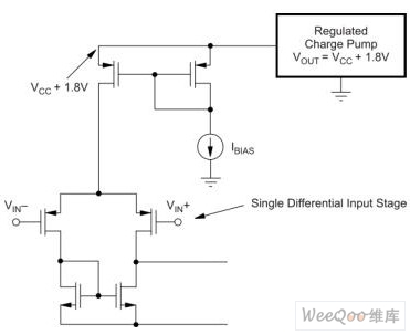 集成電路設計人員借助了其他器件的技術來解決這個問題?,F(xiàn)在,再平常不過的充電泵用來將放大器的一個單差動輸入級推至正電源以上(請參見圖1)。放大器設計人員將開關機制頻率置于放大器帶寬之上,并讓開關噪聲維持在放大器理論噪聲底限以下。