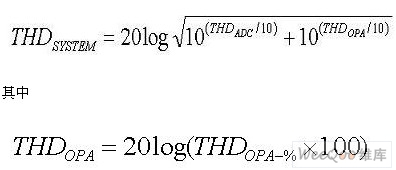 例如,由一個緩沖結(jié)構(gòu)運算放大器驅(qū)動的ADC的總諧波失真,等于ADC和運算放大器失真貢獻度的方和根。這種結(jié)構(gòu)下,系統(tǒng)THD 為: