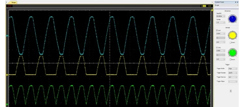 上圖是電路的最終輸出,藍(lán)色波形是輸入,黃色波形是半波整流電路的輸出,綠色波形是全波整流電路的輸出。