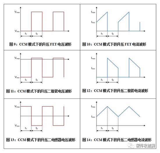 圖9至圖14顯示了非同步升壓轉(zhuǎn)換器中FET、二極管和電感器在CCM模式下的電壓和電流波形。