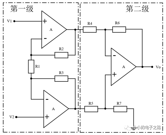 三運(yùn)放儀表放大器的電路結(jié)構(gòu)如下圖所示,可以將整個(gè)電路分為兩級:第一級為兩個(gè)同相比例運(yùn)算電路,第二級為差分運(yùn)算電路。