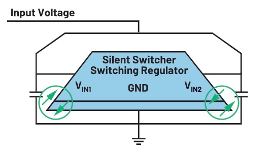 采用Silent Switcher® 技術(shù)的開關(guān)穩(wěn)壓器提供了一種非常巧妙的解決方案,可以有效地減少輻射干擾。任何開關(guān)模式電源中出現(xiàn)的脈沖電流路徑都是對稱設(shè)計的,因此產(chǎn)生的磁場在很大程度上相互抵消。該技術(shù)與倒裝芯片技術(shù)相結(jié)合可以顯著減少輻射 干擾,后者消除了開關(guān)穩(wěn)壓器IC中的鍵合線。