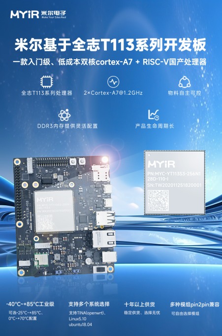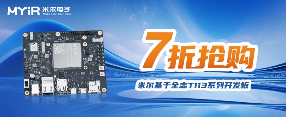 全志T113系列芯片是目前比較受歡迎的國產(chǎn)入門級(jí)嵌入式工業(yè)芯片。米爾是基于T113芯片開發(fā)較早、提供配置最全的廠家,目前是唯一一家提供T113-S和T113-i兩種芯片核心板的廠家。T113-i的核心板兼容T113-S的核心板,同一個(gè)硬件設(shè)計(jì),有多種更適合的選擇。2種芯片,多種配置,全志T113系列產(chǎn)品自上市以來已得到各行各業(yè)的應(yīng)用,為回饋廣大客戶的支持,助力國產(chǎn)芯的發(fā)展,米爾在特推出特大優(yōu)惠活動(dòng),開發(fā)板7折,限量150套!