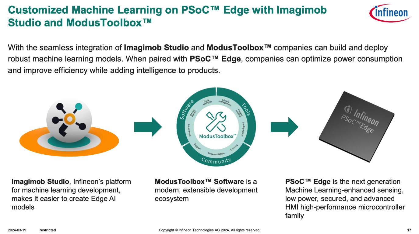 英飛凌已經(jīng)在一年前實(shí)現(xiàn)了對(duì)于TinyML開發(fā)軟件Iamgimob的收購,并將其與自家的開發(fā)平臺(tái)ModusToolbox整合在了一起,為客戶提供無縫的端側(cè)ML開發(fā)體驗(yàn)。