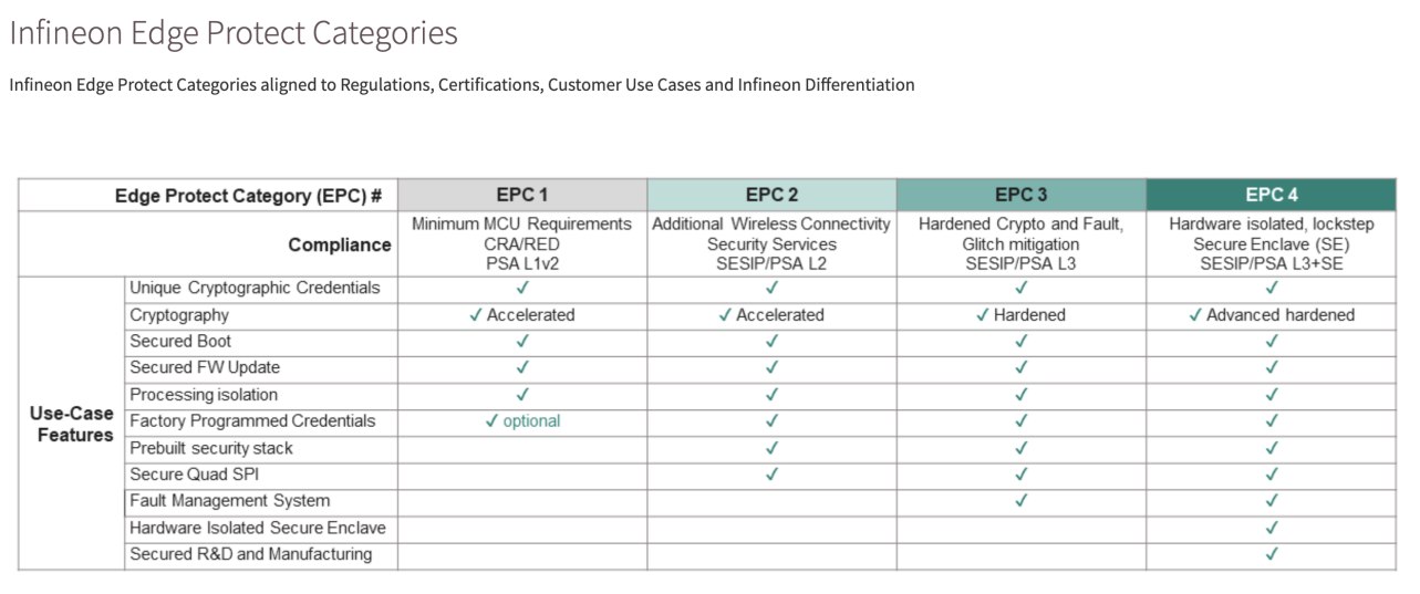結(jié)合豐富的安全產(chǎn)品經(jīng)驗(yàn),英飛凌提供了適用于物聯(lián)網(wǎng)的安全解決方案Infineon Edge Protect,包含四個(gè)等級(jí)(EPC),分別對(duì)應(yīng)了從PSA Level1到Level 3+SE的不同安全配置。其中PSOC E84支持最高的EPC4,對(duì)應(yīng)能夠達(dá)到PSA Level4的級(jí)別。特別值得一提的是,PSA Level4也是Arm與英飛凌一同重新更新的最高安全等級(jí)?!拔覀兛梢酝ㄟ^這樣的認(rèn)證讓用戶在涉及到IoT產(chǎn)品的時(shí)候確保他們用戶的數(shù)據(jù)安全,所以這也是我們跟目前其他安全類MCU相比較大的差異?!盨am Geha補(bǔ)充道。