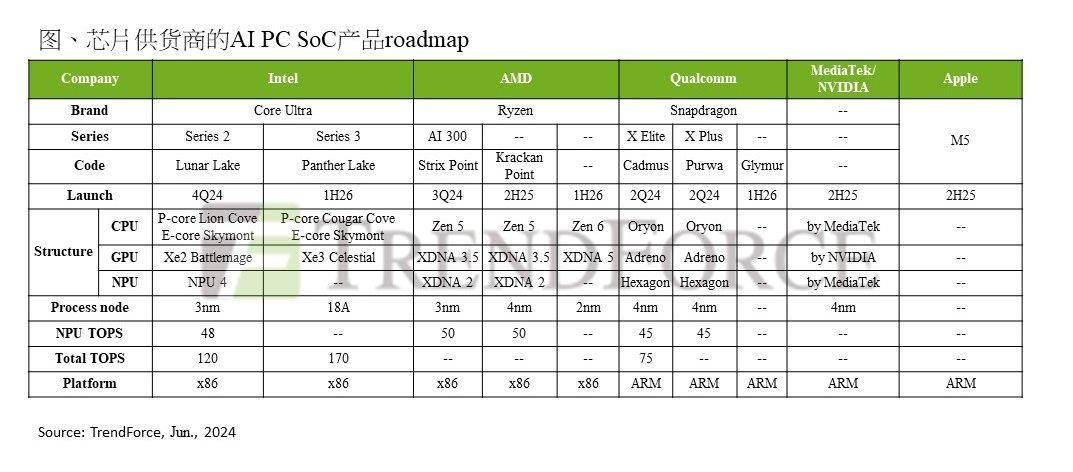 觀察近期芯片廠在AI PC的布局,Intel的Lunar Lake及AMD的Strix Point都是在本月COMPUTEX展會首次發(fā)布的SoC,并都符合AI PC標準,故盡管Lunar Lake及Strix Point所配套的PC機種分別預(yù)計于今年第四季及今年第三季才上市,PC OEM會場工作人員僅以口頭說明該兩類機種的規(guī)格表現(xiàn),但該兩款SoC及所搭載的PC機種仍為活動中市場主要關(guān)注焦點。