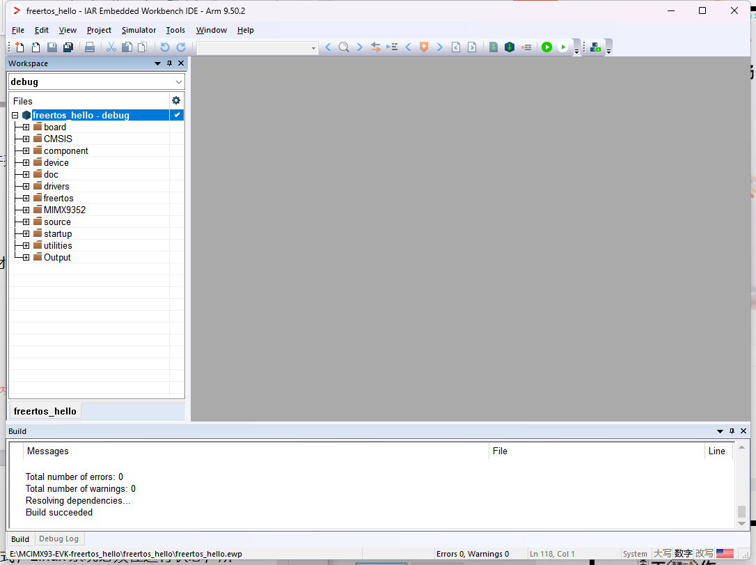 打開 IAR Embedded Workbench 軟件,點(diǎn)擊界面 [File]>[Open Workspace] 并選擇導(dǎo)入所下載的sdk,我這里選擇的是freertos_hello,在下載目錄MCIMX93-EVK-freertos_hello\freertos_hello下的freertos_hello.eww,如下圖所示