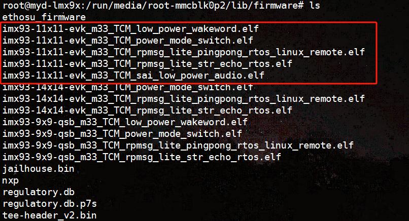 在A55 Debug(J14)和M33 Debug(J15)上分別接上串口,我這里COM25連接A55核,COM7接的M33核,上電開機(jī)進(jìn)入系統(tǒng),在目錄/run/media/root-mmcblk0p2/lib/firmware下有調(diào)試M33核的五個(gè)固件,如圖4-1所示。