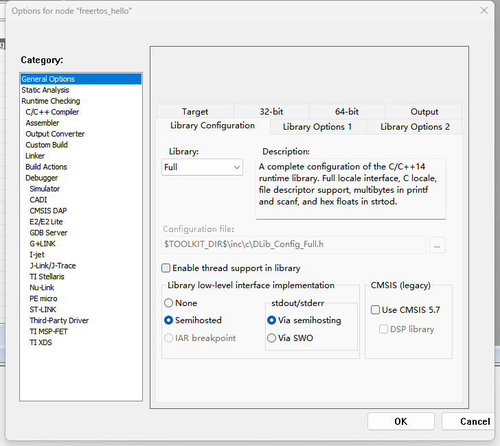 右鍵單擊freertos_hello-debug文件夾選擇Options,在General Options一欄中點(diǎn)擊Target選擇選擇芯片,這里沒有9352芯片所以選擇NXP MIMXRT595S_M33,如下圖所示