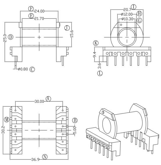 E. 輸出繞組:(引腳 7、8、9 至引腳 10、11、12):5 圈 0.5mm * 10 線(10 線并聯(lián))