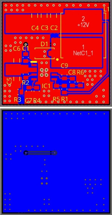 正確接地是另一個改變游戲規(guī)則的設計點。底層幾乎是實心銅平面(藍色),并被分配到地面以減少接地路徑的長度和阻抗。頂層(紅色)的空白區(qū)域也被地面覆蓋,但遵循了星形接地布局(無接地環(huán)路)規(guī)則。這種技術可確保低 EMI(發(fā)射)和輸出端的較低噪聲。