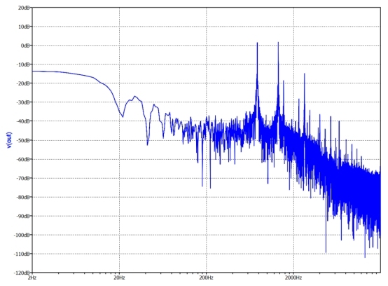 通過分析仿真產(chǎn)生的 FFT,如圖 5 所示,可以立即注意到兩個所需基頻的存在。從頻譜中我們還可以得出一些有關(guān)電氣方案功能的結(jié)論: