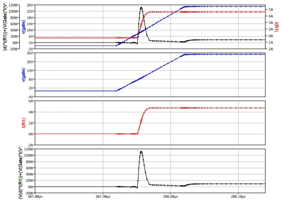 然而,需要注意的是,電子元件,尤其是開(kāi)關(guān)元件,具有非理想特性,例如非零電壓降和非瞬時(shí)開(kāi)關(guān)轉(zhuǎn)換。這些特性可能會(huì)限制元件的運(yùn)行,尤其是在高速或高能量水平下。查看SiC FET 的功率耗散圖并放大信號(hào)上升沿或下降沿的圖表就足以注意到第一個(gè)問(wèn)題。圖 5 顯示了對(duì)應(yīng)于上升沿的圖表,顯示的軌跡如下: