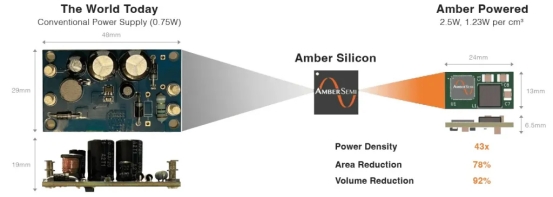 圖 1 比較了采用傳統(tǒng)技術(shù)制造的電源和基于 AmberSemi 固態(tài)技術(shù)的電源的尺寸。新技術(shù)可以提高功率密度、PCB 占用面積和整體體積。