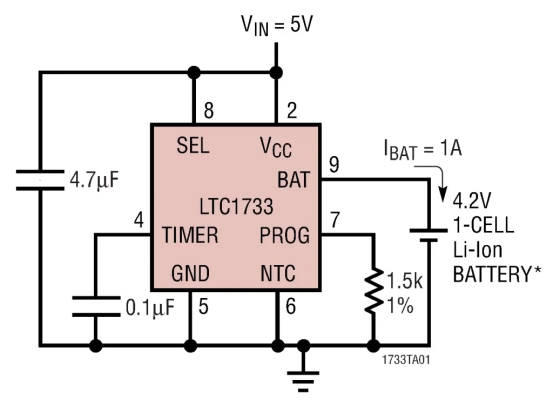市場上有很多鋰電池充電器芯片。一個不錯的選擇可能是 LTC1733。這是一款獨立的線性單節(jié)鋰充電器。它可以提供最大 1.5A 的充電電流。此外,它還能提供 1% 的充電電壓精度。圖 4 顯示了使用一些外部元件啟用 LT1733 的基本原理圖。