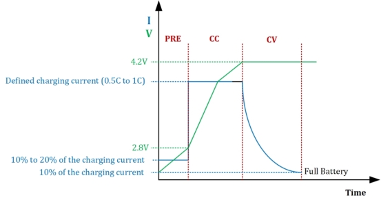 如果電池電壓高于 2.8V(或在預充電階段達到此水平),則可以以 0.5C 至 1C 左右的恒定電流進行充電。