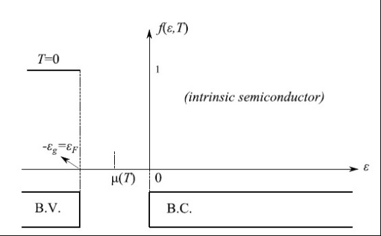 將先前找到的方程應(yīng)用于分別由電子和空穴組成的兩種費(fèi)米氣體,可以得到本征半導(dǎo)體的化學(xué)勢: