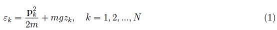 其中 p k 是第 k個(gè)分子的動(dòng)量矢量,而z k 是容器底部的相應(yīng)高度。請(qǐng)注意,剛剛寫出的關(guān)系在容器內(nèi)部有效,容器壁可以通過無限勢能屏障來表示,該屏障以數(shù)學(xué)方式轉(zhuǎn)換分子與壁碰撞的彈性性質(zhì)(機(jī)械事件導(dǎo)致氣體對(duì)壁本身施加壓力 P)。記住阿伏伽德羅常數(shù)的數(shù)量級(jí),我們有N ? 1,因此方程 (1) 給出的能譜非?!懊芗?。這種情況使我們能夠用指數(shù)k代替其中連續(xù)變量 e 表示單個(gè)分子的能量。符號(hào)為:
