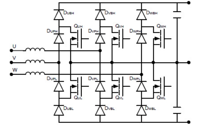 充電站中的充電電路部分功能與功率范圍和直流充電樁類(lèi)似,作用是用電網(wǎng)交流電源給汽車(chē)電池充電,功率也同樣是超過(guò)OBC功率的大功率快速充電,通常大于50kW。其對(duì)接電網(wǎng)部分是三相有源功率因數(shù)校正電路,以下以PFC簡(jiǎn)稱。PFC 可保持輸入電流和電壓之間的相位關(guān)系,并將線路/電網(wǎng)電流中的總諧波失真 (THD) 降至最低?,F(xiàn)在新的設(shè)計(jì)越來(lái)越多的需要雙向工作的能力,實(shí)現(xiàn)能量在電池與電網(wǎng)間的雙向流動(dòng)。目前流行的三相PFC線路有三種:6開(kāi)關(guān),T-NPC,I-NPC。