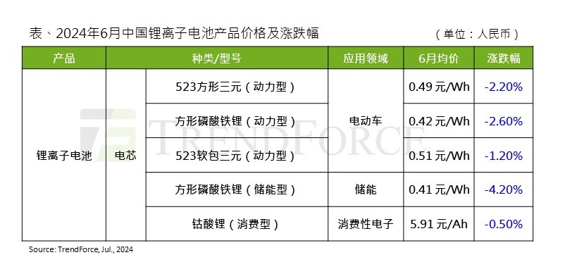 TrendForce集邦咨詢統(tǒng)計,6月動力電芯價格環(huán)比下跌1-2%,其中方形三元、方形鐵鋰和軟包型三元動力電芯月均價分別為0.49元/Wh、0.42元/Wh和0.51元/Wh。