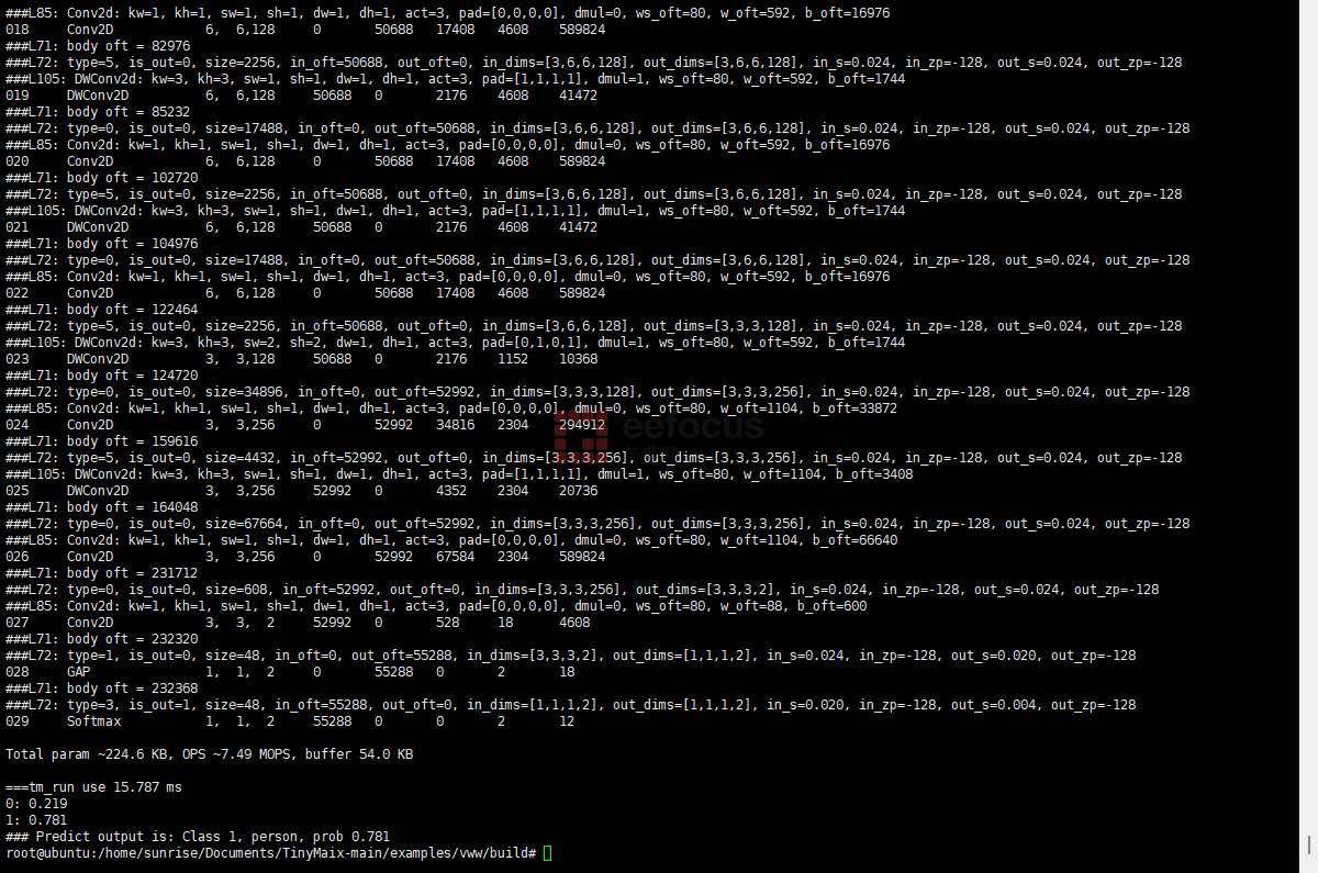 MBNET 示例運(yùn)行輸入了一張 96×96×3 的 RGB 圖像,輸出 1000 分類(lèi),共消耗了 16.615 毫秒