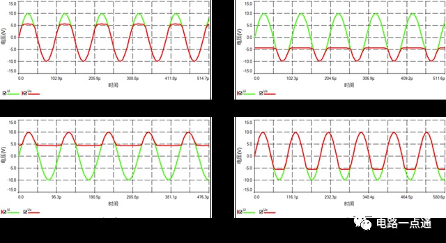 (2)、(3)、(4)分析方法與(1)一致,這里就不作分析了。每一個電路輸出的波形如下。