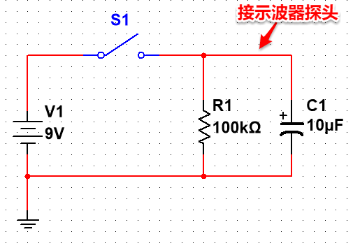 2. 上電后,C1 上端會出現(xiàn)電源的 9V 電壓,由于電容兩端的電壓不能突變,電容 C1 的下端也出現(xiàn) 9V 電壓。注意:此時,由于開關(guān)還是斷開的,電容沒有充電。