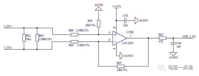 下面舉一個(gè)例子:電流采樣電路,該電路是將經(jīng)過采樣電阻的微弱電壓經(jīng)過差分放大接入ADC模數(shù)轉(zhuǎn)換接口,電流經(jīng)過采樣電阻時(shí),采樣電阻兩端形成電壓,由于電壓較小,直接接入ADC接口誤差較大,所以經(jīng)過運(yùn)放放大(此處用的是差分放大)。