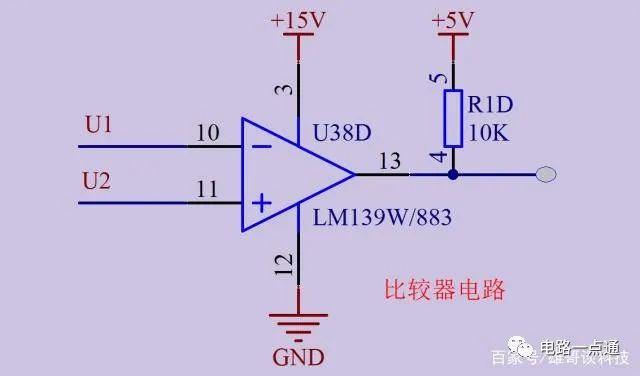 比較器屬于開環(huán)電路,它的用途簡單,作用是比較輸出端U1和U2的電壓大小,當(dāng)正輸入端電壓較大時(shí)(U2>U1),輸出高電平(注意:比較器屬于OC輸出,輸出端需加上拉電阻,上拉幾伏則輸出幾伏,否則輸出為開路);當(dāng)負(fù)輸入端電壓較大時(shí)(U1>U2),輸出低電平(GND)。