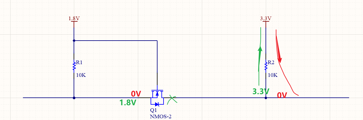 當(dāng)左邊芯片內(nèi)部開關(guān)斷開時(shí),電阻R1被上拉,此時(shí)MOS管Q1的源極電壓為1.8V,Vgs=0V,因此MOS管漏極的電壓會(huì)被右邊的3.3V電經(jīng)過電阻R2拉為3.3V。