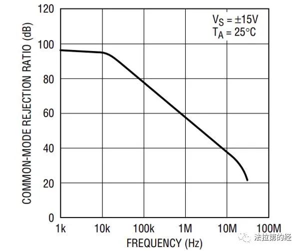 常見的運放低頻CMRR一般在70dB~120dB,更高的可達(dá)150dB左右。另外輸入信號的頻率對CMRR有很大的影響,如下圖3為ADI LT1358運放的CMRR隨頻率的關(guān)系,可以看到隨著頻率的增大CMRR迅速衰減。這是為什么呢?這是因為集成運放各級之間存在寄生耦合電容,這些寄生電容隨著頻率的升高容抗快速下降從而導(dǎo)致對共模信號抑制能力減弱。