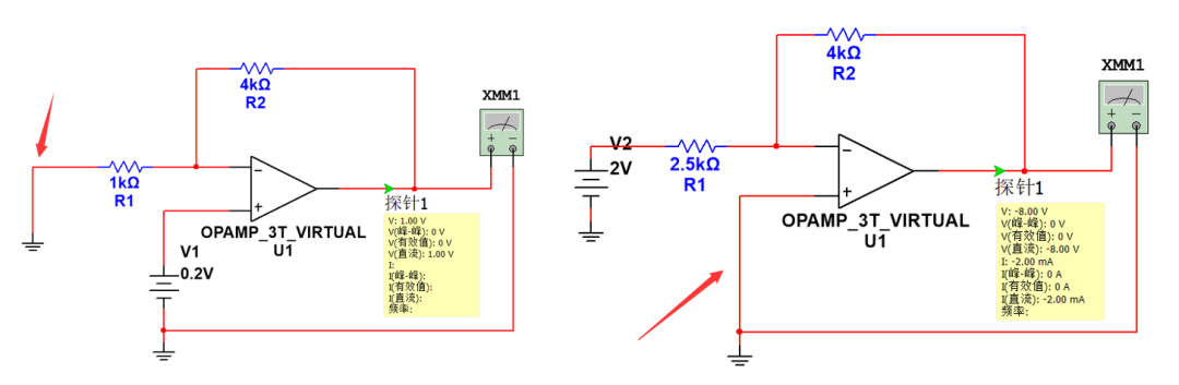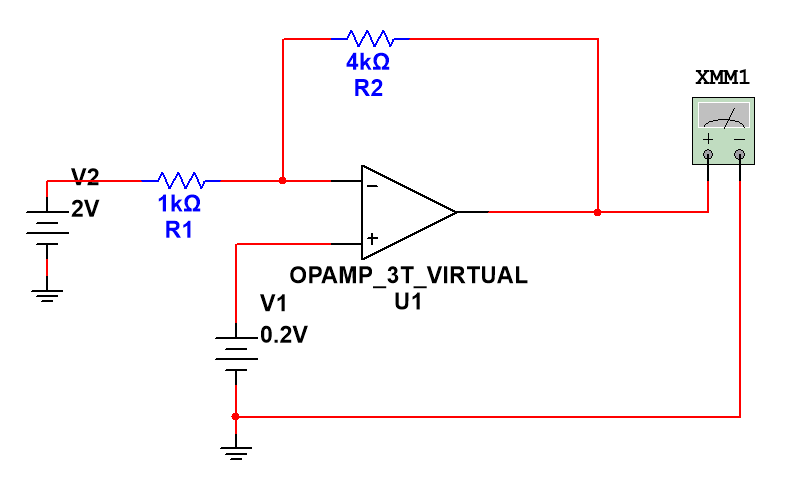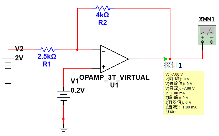 然后如右圖,把0.2V電源去掉,同樣等效為接地,那么電路等效為一個(gè)反向比例放大器,放大倍數(shù)等于 -R2/R1 = -4倍,那么輸出電壓就為2*(-4)=-8V。(勘誤:R1為1k)