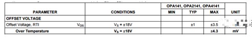 同相輸入端接地,我們當(dāng)然認(rèn)為,輸出值是運(yùn)放的失調(diào)電壓,我們先看看OPA141的失調(diào)電壓是多少,如下圖所示,最大失調(diào)電壓為4.3mV。