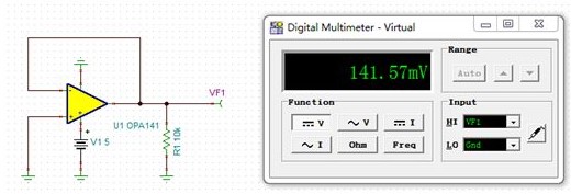 根據(jù)這一參數(shù),單電源+5V供電時(shí),輸出Vout:0V+0.2Vto 5V-0.2V即0.2V to 4.8V,也就是說+5V供電時(shí),輸出在0.2V至4.8V之間才是線性的,如果輸出不在這個(gè)范圍內(nèi),輸出信號(hào)將會(huì)失真或者出現(xiàn)非線性。OPA141跟隨電路的輸入是0V,理論上運(yùn)放的輸出也將跟隨到0V,但是這已經(jīng)低于了輸出電壓范圍的最小值了,輸出不再線性,即這里的141.57mV。